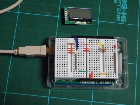 秋月電子の付属説明書などを参考に、ロマンチック・アイロニーさんのスケッチを手本として、電源電圧が5Vで動作するスケッチに変更(Power/IconControle/ContrastSetのBonをoffにするだけ)し、UNOに書き込んだところ、正常に動作した。I2CでLCDを使う上で、注意すべき点をいくつか、