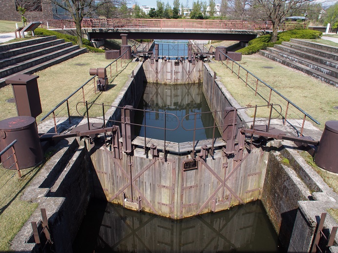 あ、環水公園には、小さな閘門として国の指定有形文化財に指定されている「牛島閘門」もあります。