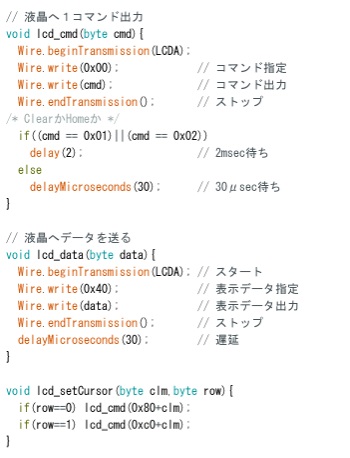 なお、コントロールチップが同じLCDでは、本スケッチをそのまま使えるが、コントロールチップが異なる他のLCDの場合、スレーブアドレスやコントロールが異なるので、他のLCDで利用する場合は注意が必要です。