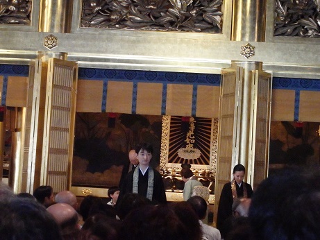 食事後、本願寺境内に移動し、全員で記念撮影。後、御影堂の中に入る。御影堂の中の席は既に決められており、ほぼ真ん中で、祭壇がよく見える場所でした。御影堂は天井が高く、面積も広いが(1000人程度が入れそう)、時間が経つにつれほぼ人で埋まってきて、暑くなってきた。扇風機が設置されているが手持ちの扇子で何とかしのぐ。法要の開始時間(14:00)が来ると約1時間の法要が始まる。法要に続き、門主さんの家族が揃って、伝灯のつどいが行われ、門徒との質疑応答(?)などが行われた。法要終了後、桃山時代に作られた普段は非公開の国宝の書院、飛雲閣を見学した。