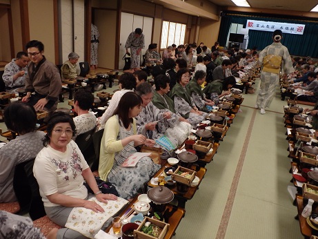 湯の花温泉は京の奥座敷と呼ばれ、武将が刀傷を癒やしたとされる古い温泉で、渓山閣の謳い文句は「おもてなしの宿」とのこと。温泉で160人の宴会(懇親会)はなかなか経験できなことで、芸達者な仲居さんが踊りや歌を披露し、参加者のカラオケも全開で、大いに盛り上がった。