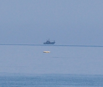 | 海岸線が少し伸び上がっている | 通常(?)の景色 | 沖合の舟が上がって見える |