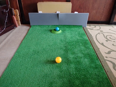 自作のパット練習コート (人工芝+カップ+段ボール) |