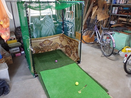 パットの練習コートを、人工芝(@200)+スポンジ(@200)+段ボール(@0)+カップ(@900)で自作し、パット練習を家で少しやったところ、グリーン周りでは近いところにコントロールできるようになったが、ティショットが安定しない。そこで、鉄製アングル(約@500×12本)+ネット(約@3,000)+古絨毯(@0)でショット練習ネット(w1200xd900xh1500mm)を自作し、ティショットの練習を行ったところ、練習では芯に近いところに当たるようになってきたが、グランドに出るとやはり力が入り、思ったほど距離が伸びず、方向も不安定です。