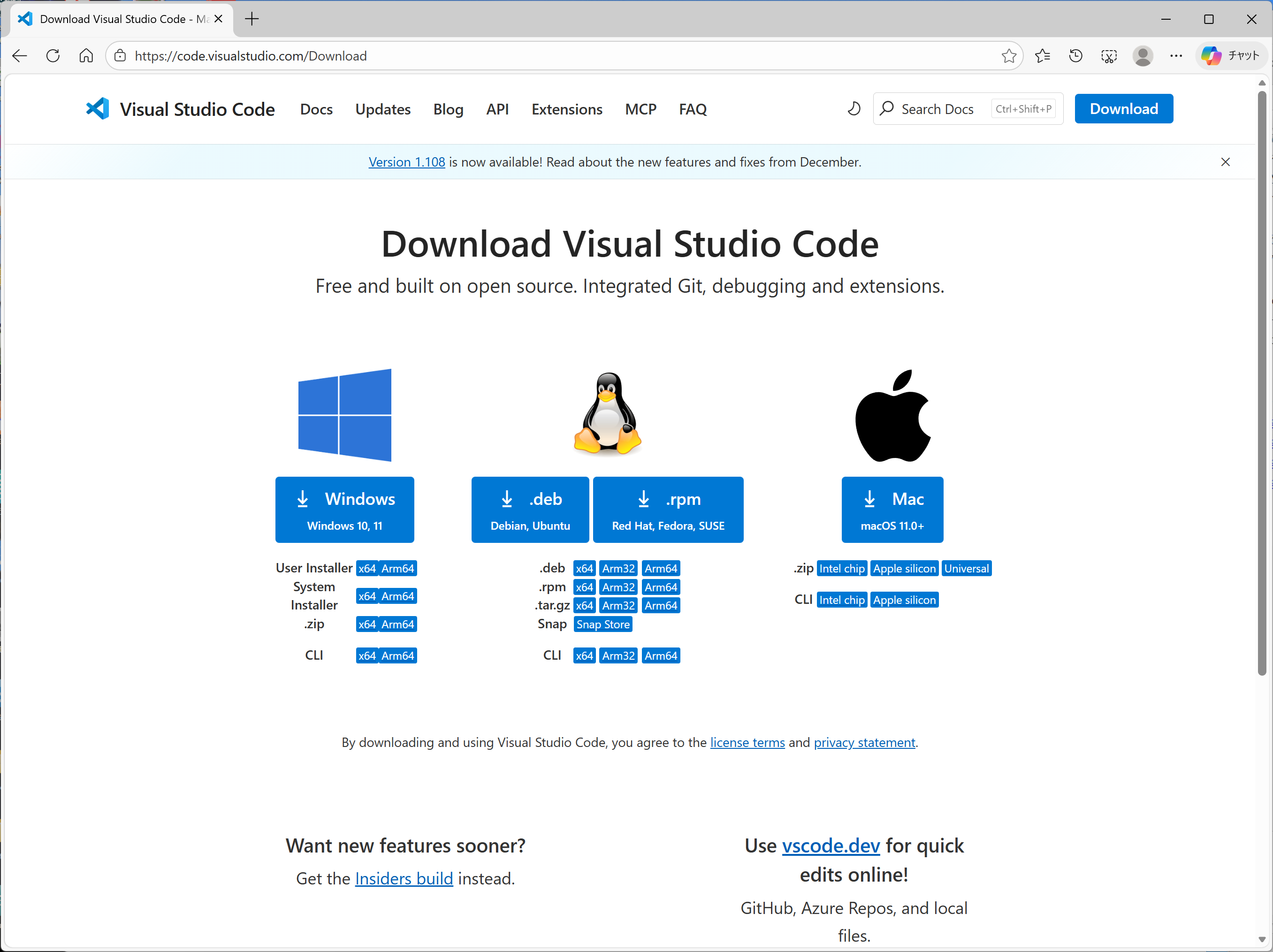 ![]() VSCodeのダウンロード画面 |