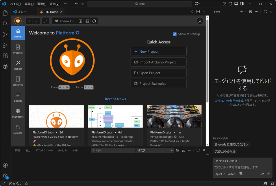 PlatformIO は Arduino, ESP32, STM32 などのマイコン開発を VSCode 上で快適に行えるツールで、従来のArduino_IDEより高速かつ高機能で、多様なフレームワークをサポートし、自動化されたビルド環境、テストやデバッグ機能も備えています。なお、PlatformIOを動かすにはPythonのインストールも必要です。