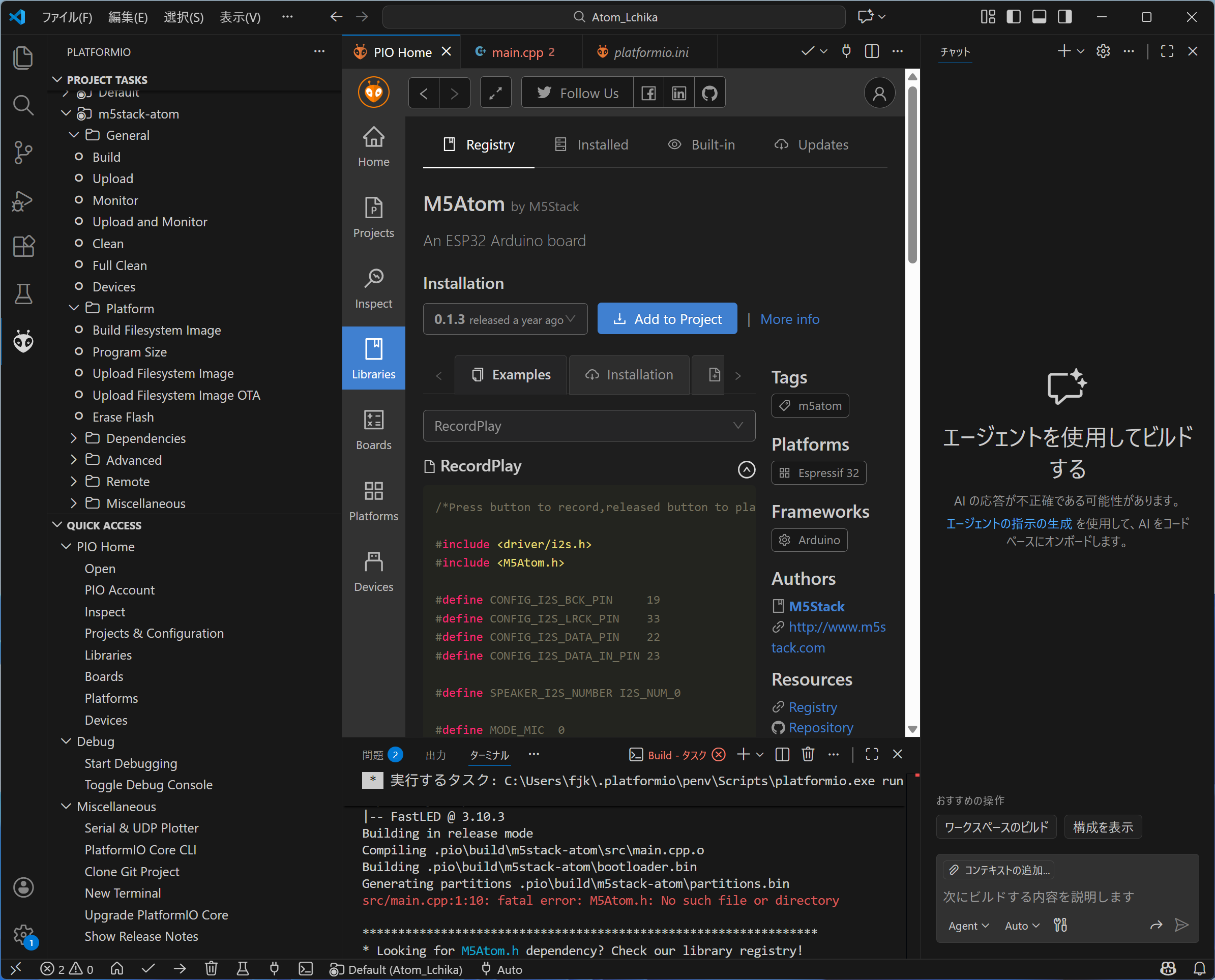 Atomを含むM5-Stackシリーズの開発には、Arduino_IDEやUIFLOWが有名ですが、最近はVS_Code上でPlatformIOが使われることが多くなってきています。