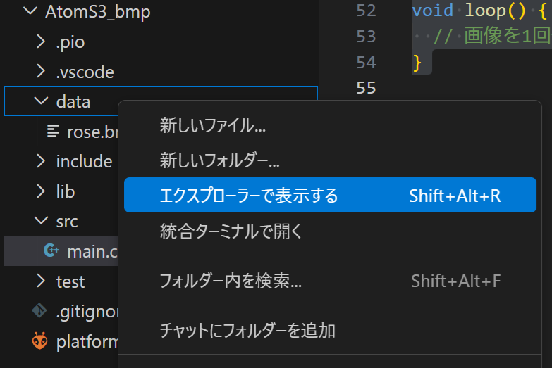 - B dataフォルダを右クリック、「エクスプローラで表示する」を選択。作製したBMPファイルをdataフォルダにコピー。
