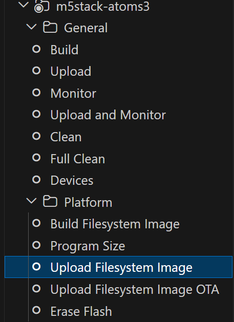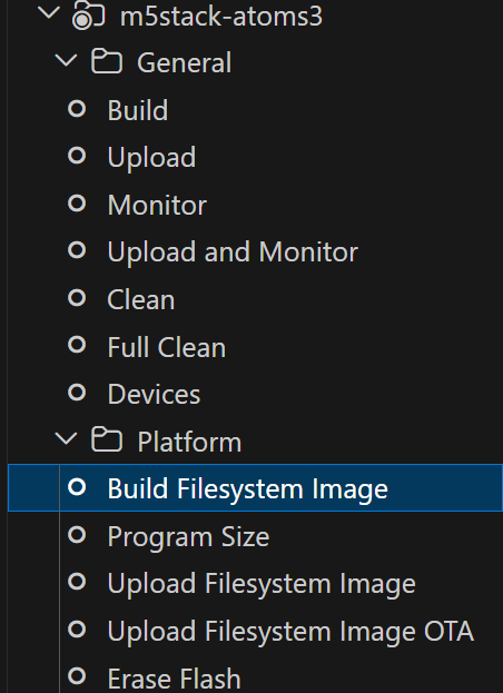 - D [Build Filesystem Image]をクリックしてフォーマットをした後に[Upload Filesystem Image]をクリックすることで [data]フォルダ内に保存されているデータがSPIFFSに書き込まれます。