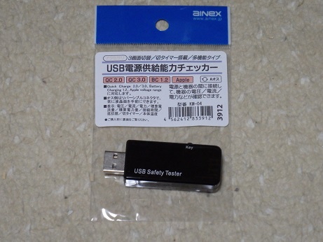 USB電源をモニタするチェッカーがないか探していたところ、Mパーツで「USB電源供給能力チェッカー」(KM-04、AINEX、\1,680)を見つけ購入した。早速ArduiboUNOのUSB供給端子の間に接続してみると、5V/0.04Aが表示された。本体側面に付いているkeyスイッチで電圧、電流、積算電流量、積算電力量、接続時間の表示切替可能で、本製品をUSB2.0の途中に挟んでもデータの通信が問題なくできる。なお、USBバッテリからの電源供給時には本製品が応答しない電源やバッテリーもある。特に充電量の表示器が無いUSBバッテリなどの充電状況確認に便利である。