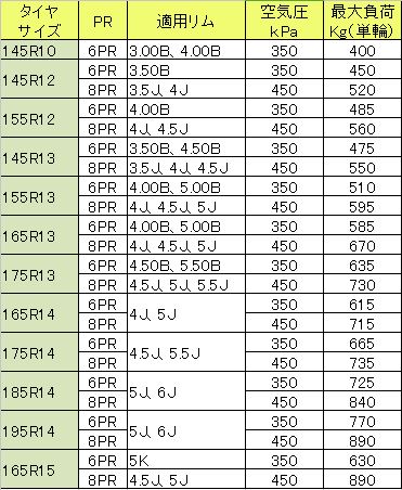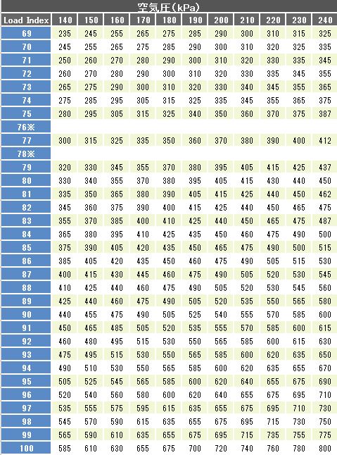 今まで、LIは気にしていなかったが、これがタイヤの購入時に車種を聞かれる一つの要素となっている。LIとはタイヤ1本にかかる最大の負荷能力で、JATMA規格ではLI95は690kgとなっている(4本で2760kgの車を支えられる)。また、負荷荷重はLIとタイヤ空気圧で決まり、LI95で空気圧を240Kpaとすると690kgですが、空気圧を200Kpaにすると620kg(2480kg)に低下する。JATMA規格では最大空気圧が240Kpa(ヨーロッパ規格では250Kpa、耐荷重性能強化タイプでは290KpaがMAX)なので、より大きな荷重を支えるにはLIが大きいタイヤを選ぶ必要がある。
