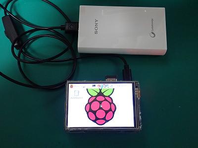 ディスプレィのコネクターをラズパイのGPIOに合うようにラズパイの上にセットし、側面のHDMIポートを付属のHDMI接続ブリッジで接続。電源にはUSB出力が5V-3.0A供給できるラズパイ用電源(中間スイッチ付き、1,580円)をラズパイのUSB端子に接続した(両方に電源を別々に供給しても良い)。(SONYの5V-3A出力できるモバイルバッテリCP-E87Cでも動作確認済み)。