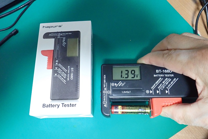 電池が使えるかどうかの確認には、テスターで電圧を測っているが、測定の都度に測定ケーブルを出したり、格納したりするのが面倒です。プローブを使わず電池の残容量をLEDやメーターで表示するテスターもありますが、もっと性格にデジタルで知りたいと思い、ネットで調べていると、ノギスのような形状で簡単に電池の電圧をデジタルで測定できるBT-168D(\690、hapurs)をアマゾンで見つけ、ボタンをクリック。注文の翌日には商品が届いた(秋月電子では\420、もっと安価な出品もあるが、中国から送られてくるので、納品までに時間がかかる)。