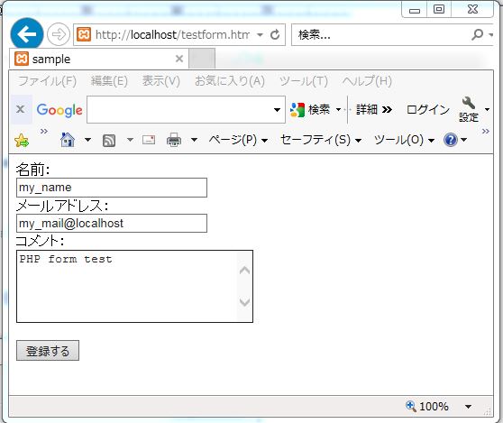 <html> <head> <meta http-equiv="Content-Type" content="text/html; charset=utf-8" > <title>testform</title> </head> <body> <form action="regist.php" method="post"> 名前:<br> <input type="text" name="name" size="30" value="" ><br> メールアドレス:<br> <input type="text" name="mail" size="30" value="" ><br> コメント:<br> <textarea name="comment" cols="30" rows="5"></textarea><br> <br> <input type="submit" value="登録する" > </form> </body> </html> |