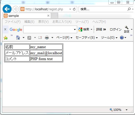 <html> <head> <meta http-equiv="Content-Type" content="text/html; charset=utf-8" > <title>regist</title> </head> <body> <table border="1"> <tr><td>名前</td><td><?php echo htmlspecialchars($_POST["name"], ENT_QUOTES) ?></td> </tr> <tr><td>メールアドレス</td><td><?php echo htmlspecialchars($_POST["mail"], ENT_QUOTES) ?></td> </tr> <tr><td>コメント</td><td><?php echo nl2br(htmlspecialchars($_POST["comment"], ENT_QUOTES)) ?></td> </tr> </table> </body> </html> |