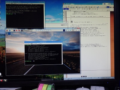 | カットしたケースに固定したラズパイZero | SSH(上)、VNCでパソコンからリモート中 |