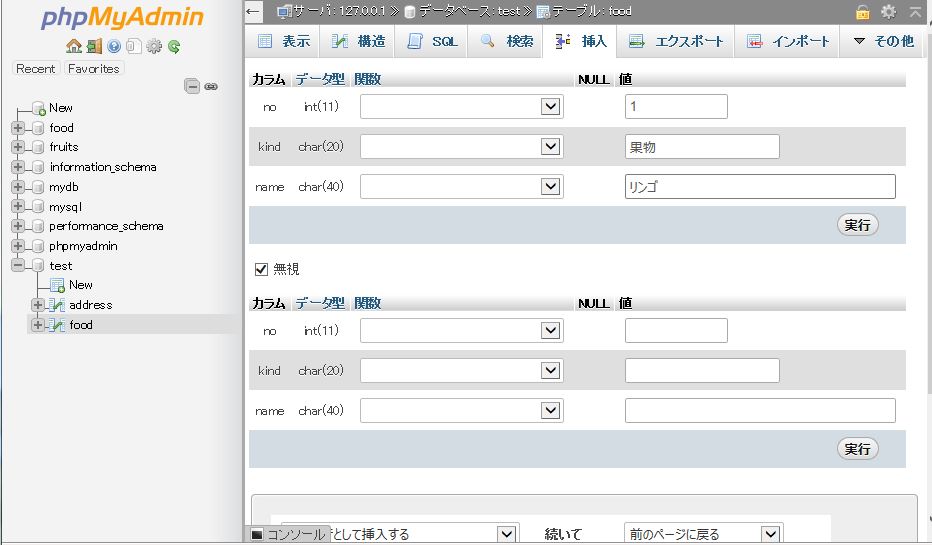 | SQLコマンド入力画面 | phpMyAdminでデータ入力 | 入力したデータ例 |