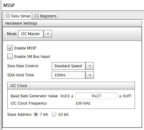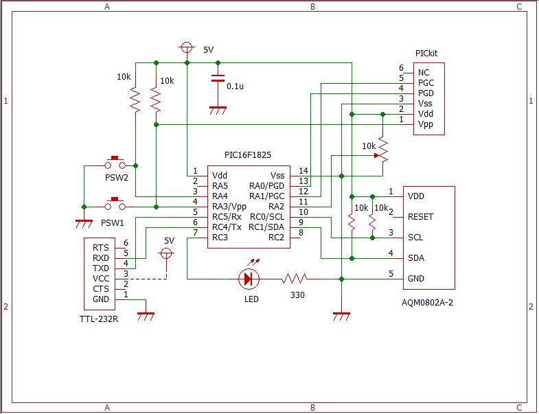 PICの動作やメッセージを表示させるため、I2C接続のLCD(AQM0802A、秋月)を使う。PICでI2Cを使うには、MSSPでI2Cを設定する。