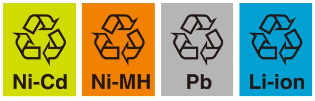 なお、小型二次電池は「資源有効利用促進法」により、リサイクルすることが義務付けられ、回収対象の電池は上のようなマークが付けられている。必ず住んでいる自治体のゴミマニュアルに従うこと。