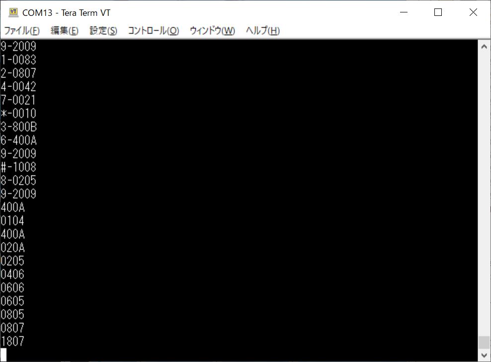 PIC16F18323を利用した4x3キーユニットで、キー入力と通信テストを行ったところ、LCD画面およびパソコンのテラターム画面に、入力データが正常に表示されることを確認できた。