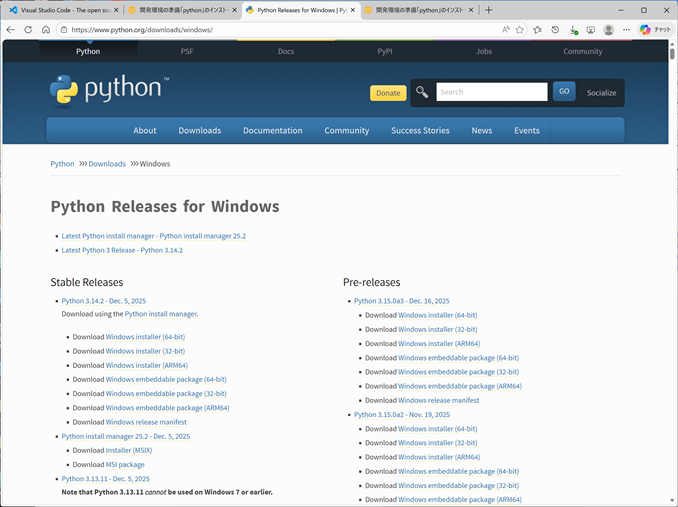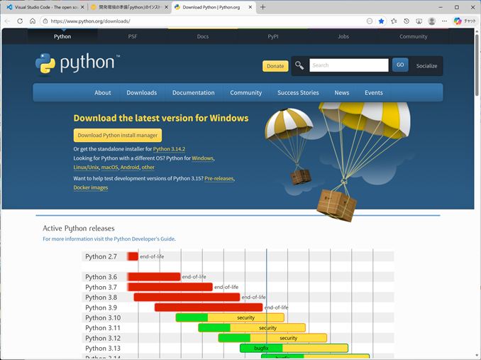 ![]() Pythonダウンロード画面 |