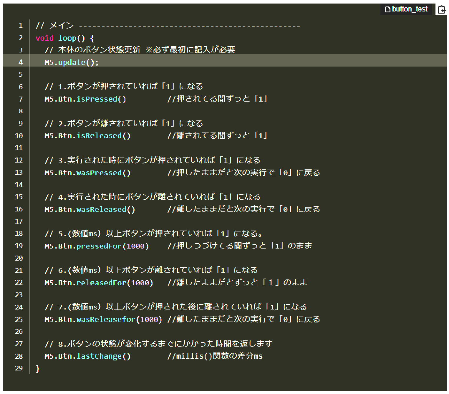 そこで、デモプログラムと同じように、スイッチを押すと色が変わるプログラムの作製を考えたが、全く同じではデモプログラムと区別が付かないので、LED点灯をブリンクさせることにした。